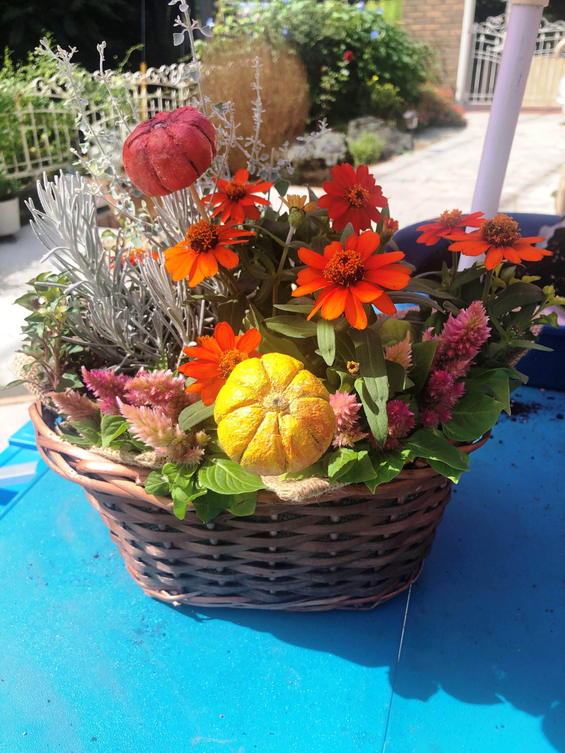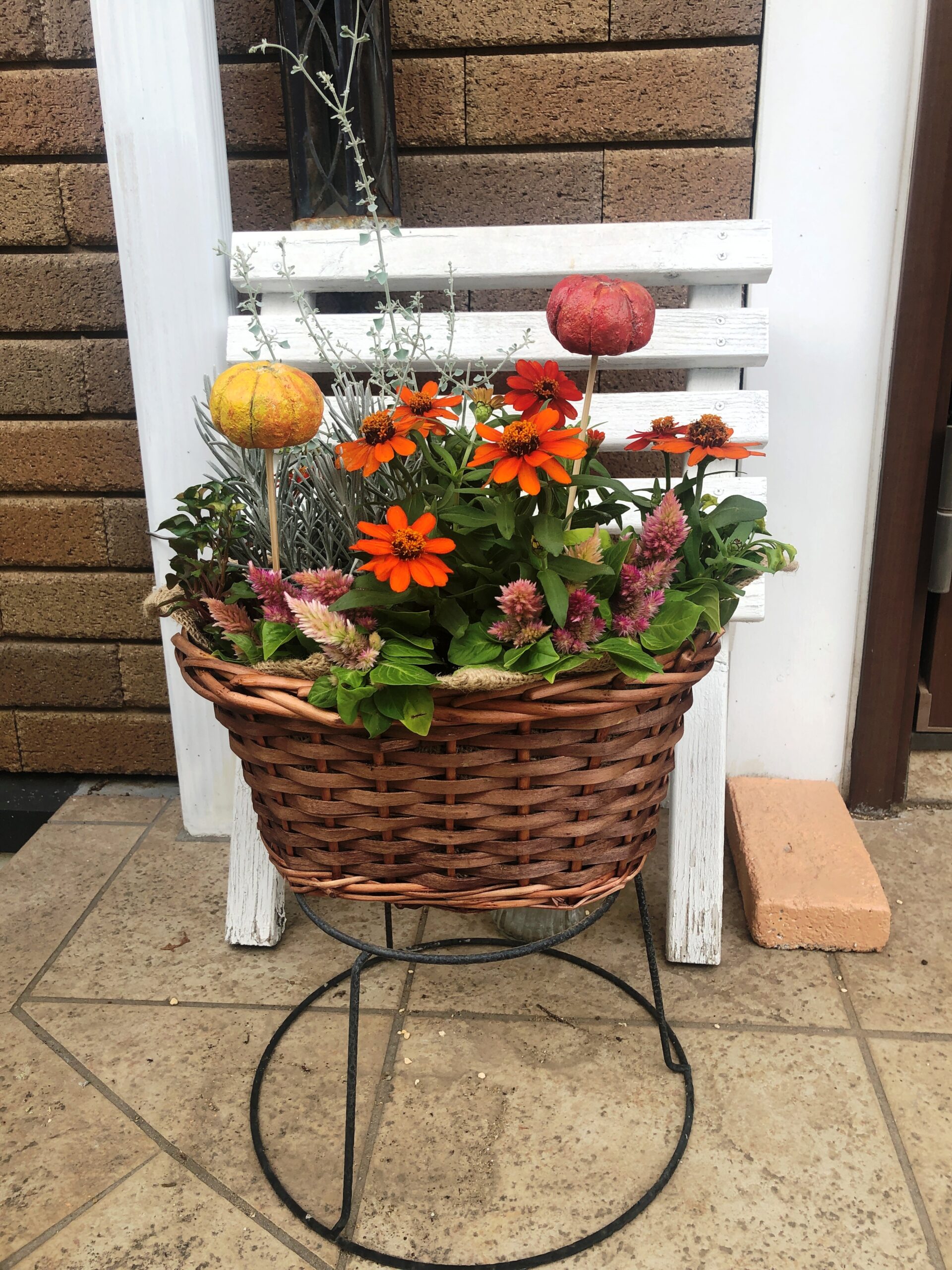 かぼちゃのアイテムを挿してハロウィンバージョンの寄せ植え完成です。飾る場所でかぼちゃのアイテムを移動させています!