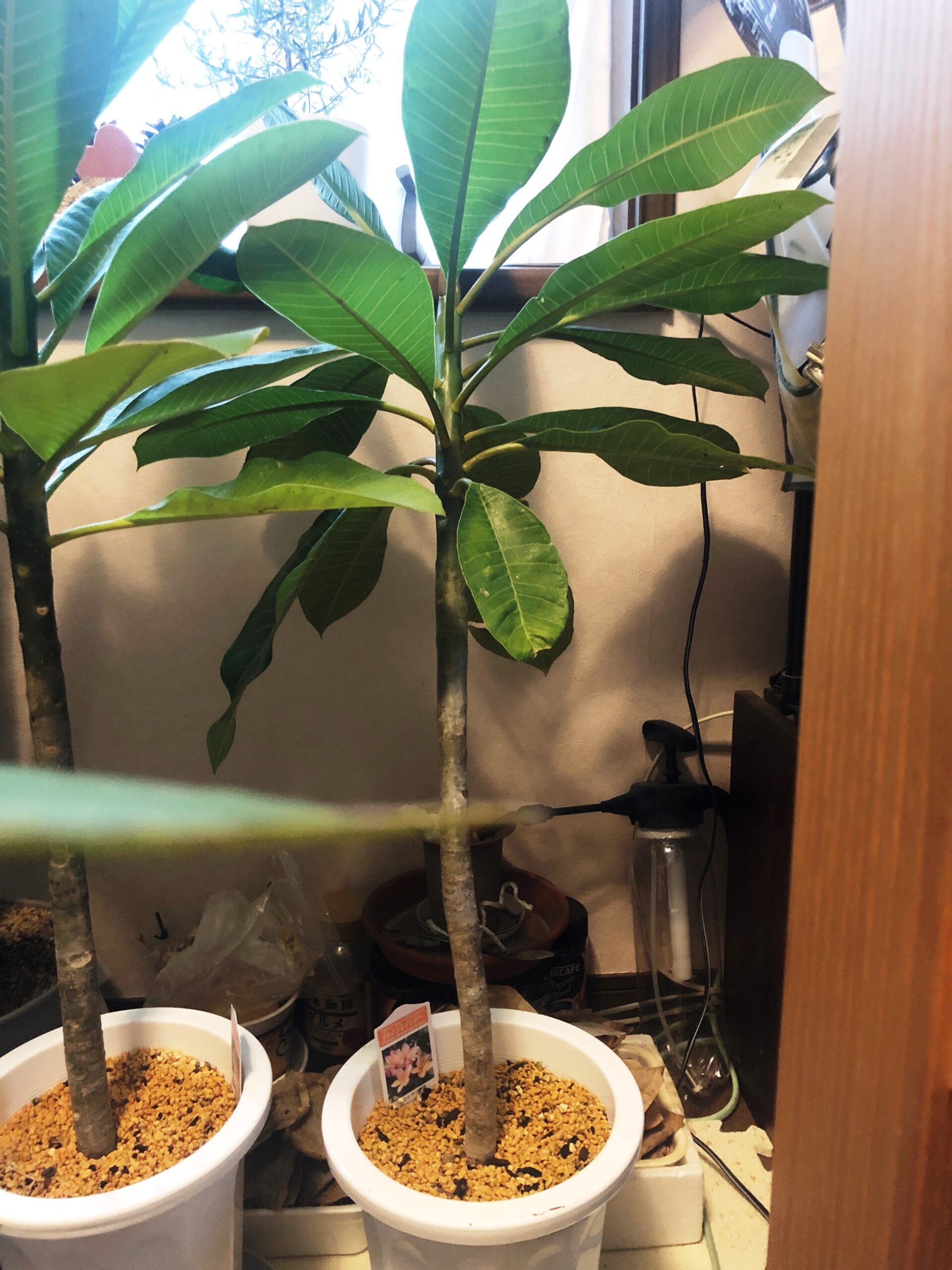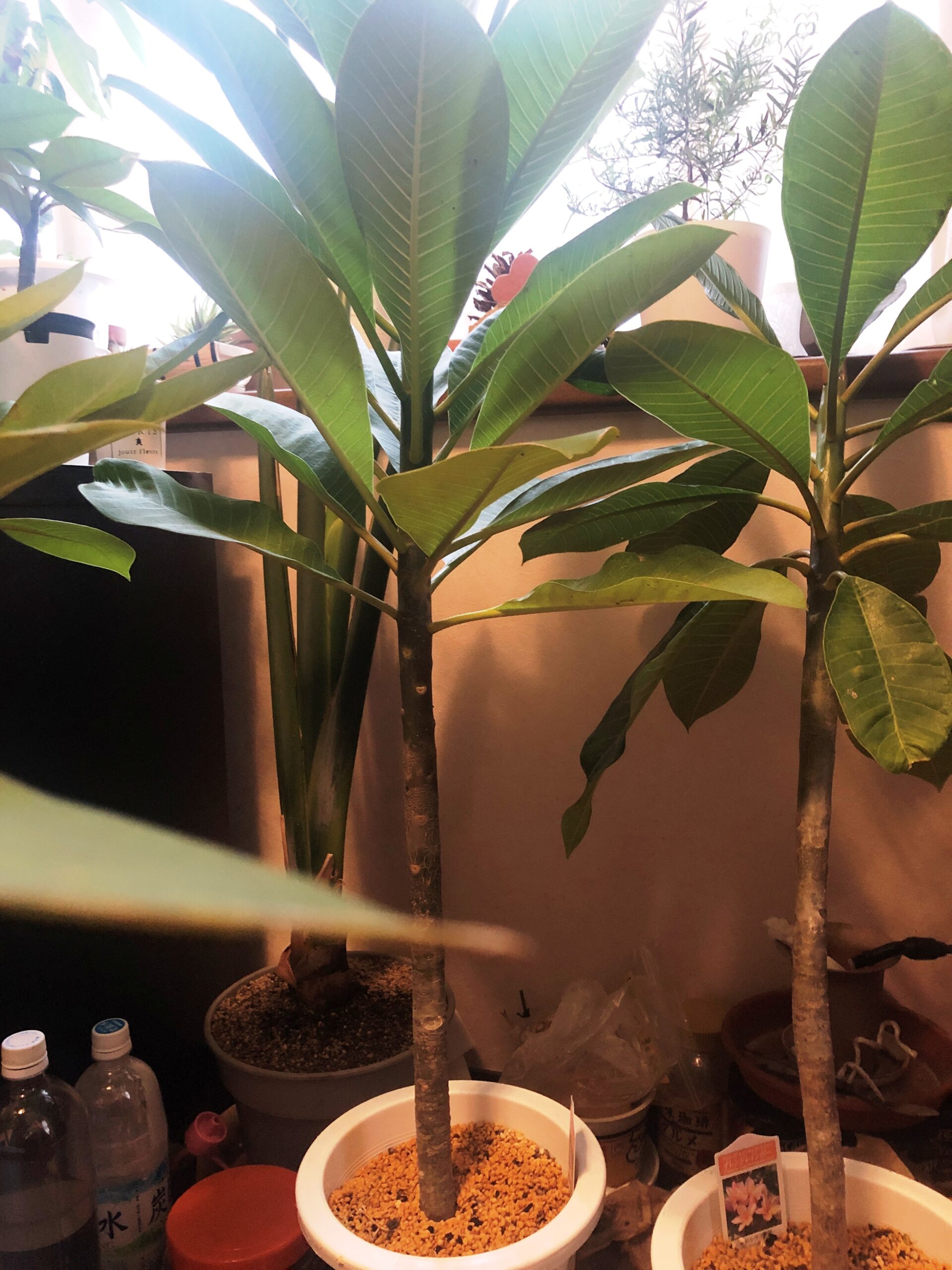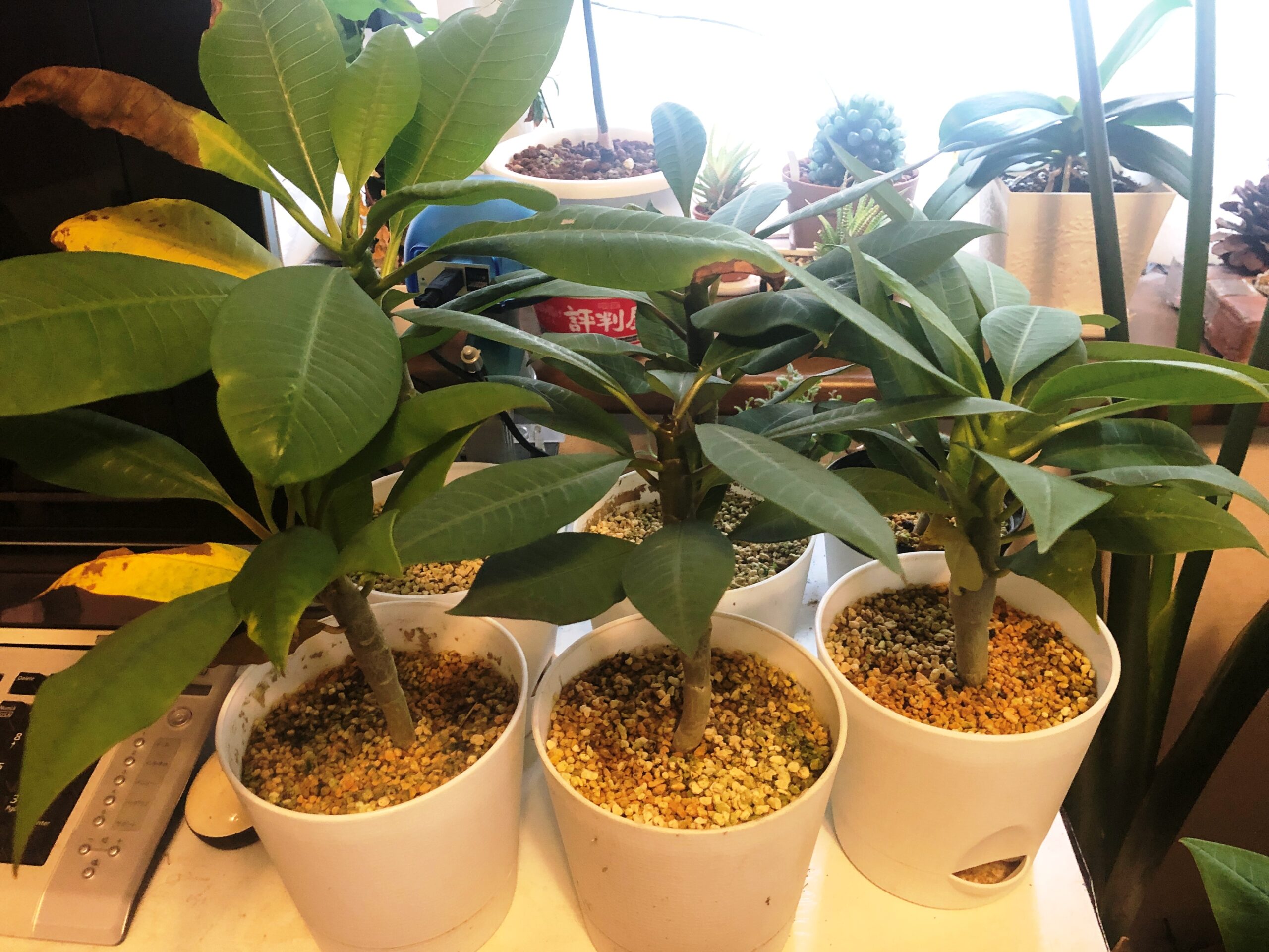 タネから育てたプルメリアの一部です。他の苗はサンルームで冬越しさせてみようと思います!