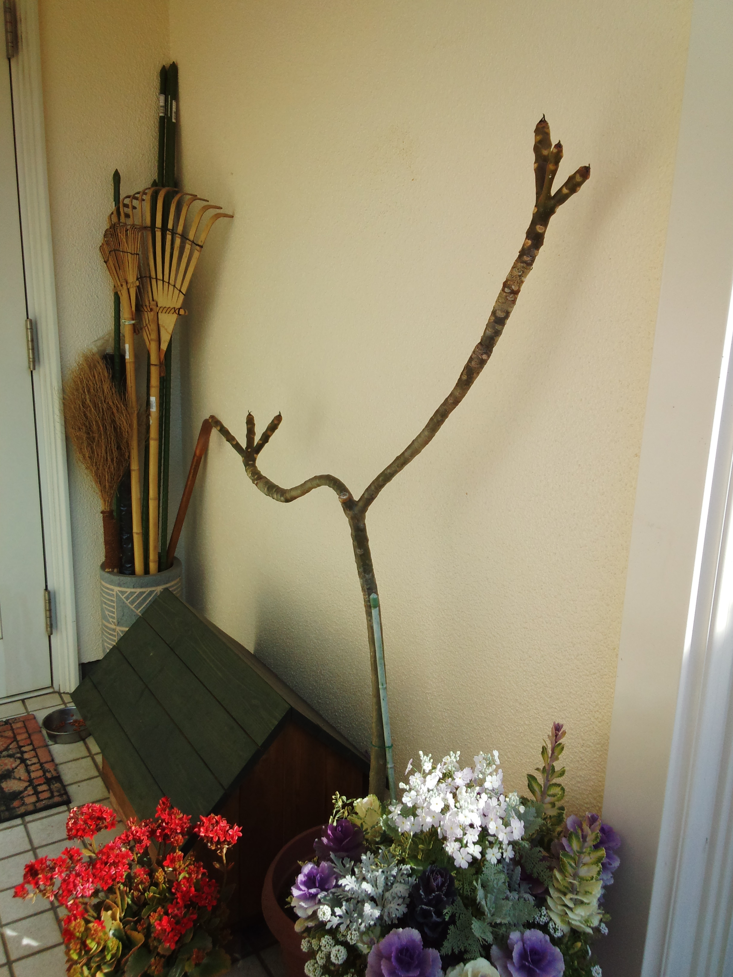 玄関脇で寒さに耐え、春が来るのを必死で待っています!真冬の間は水やりを月に1回程度に控え、霜のあたらないところに置きました!