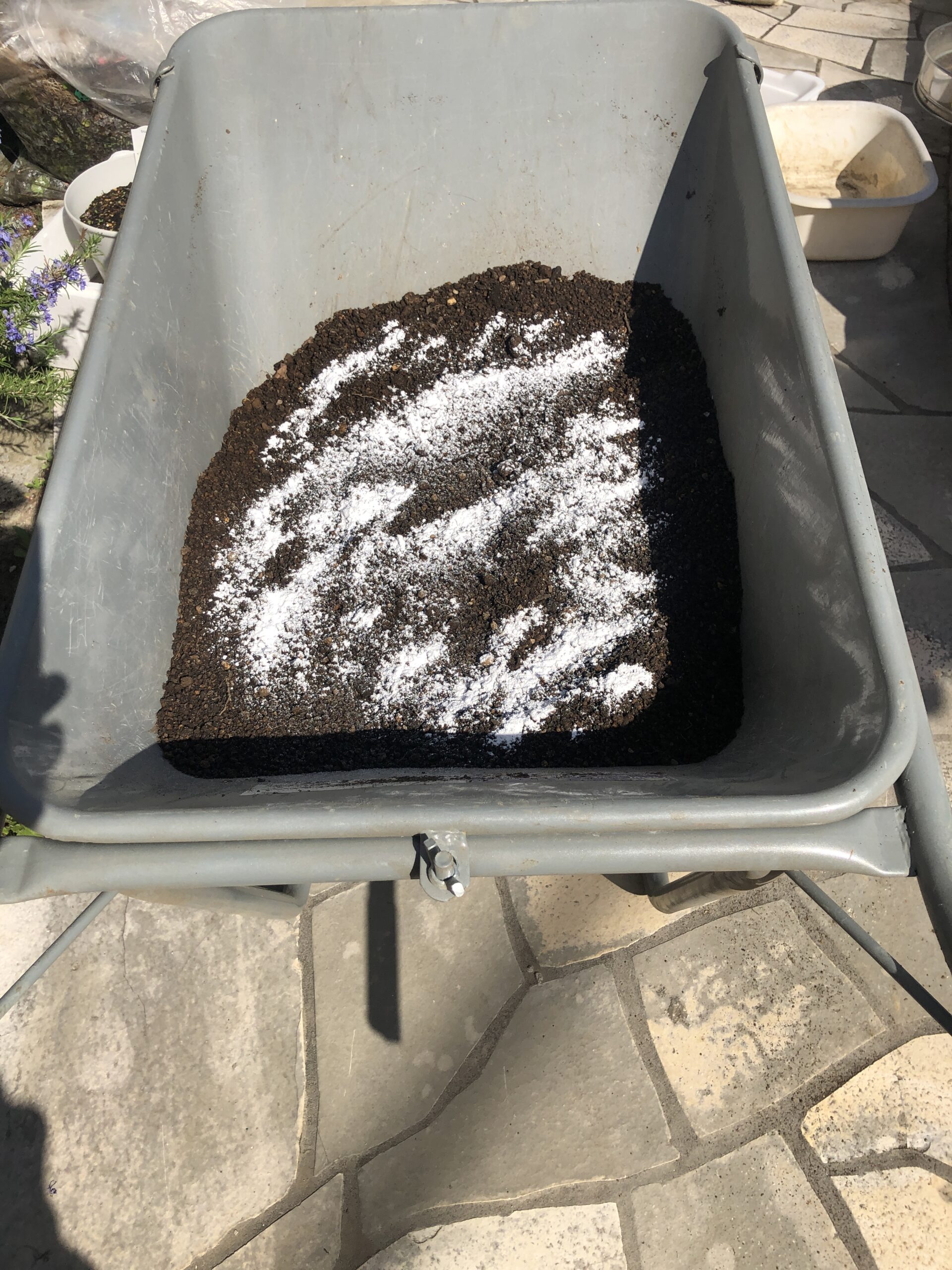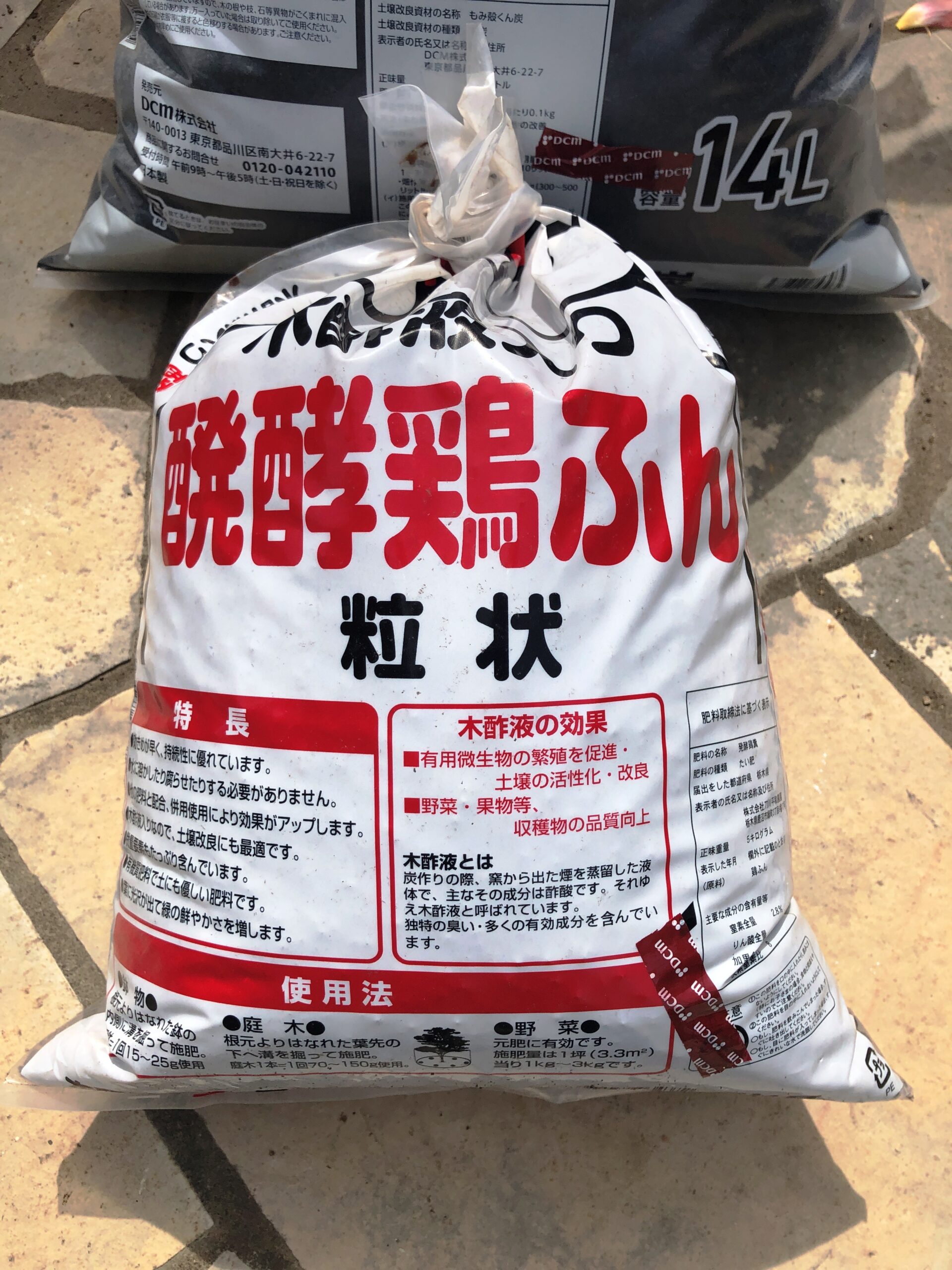 米ぬかです。消毒した土を天日で乾かし、米ぬかと腐葉土を混ぜ込みます。水を軽く湿る程度入れて良くかき混ぜます。(米ぬかは直接蒔くと発酵熱を出すので、蒔いた後すぐに植えつけは避けた方が良いそうです。)雨が入らないように約半年間保管していました。たまに土をかき回す必要があります!・・・好気性バクテリアを増やす為