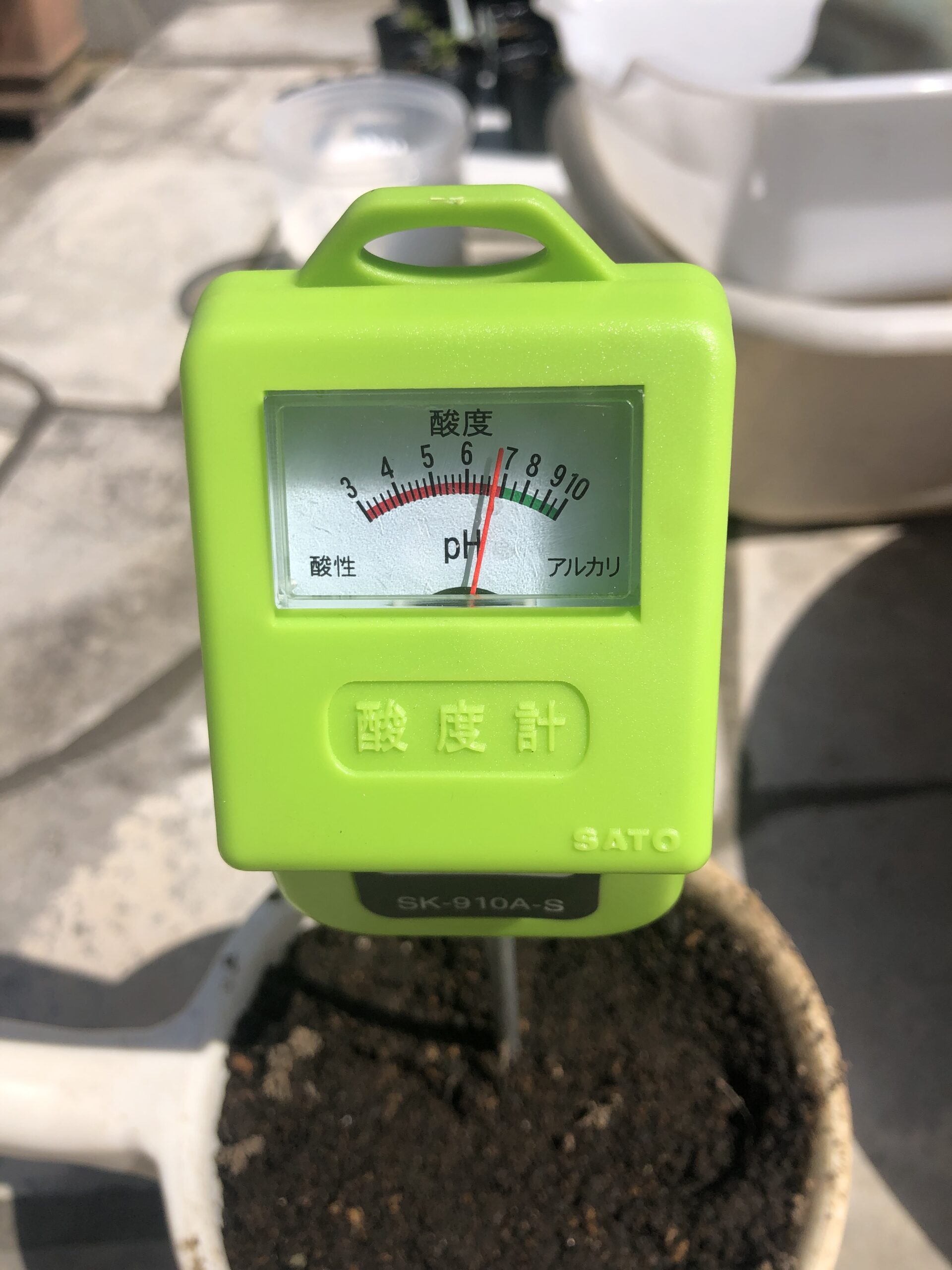 サンゴを飼っていた時の酸度計です。安い物を買ったので結果が出るまでに30分程度かかります。殺菌の為、濃い木酢液をかけているので少し酸性に寄っています!