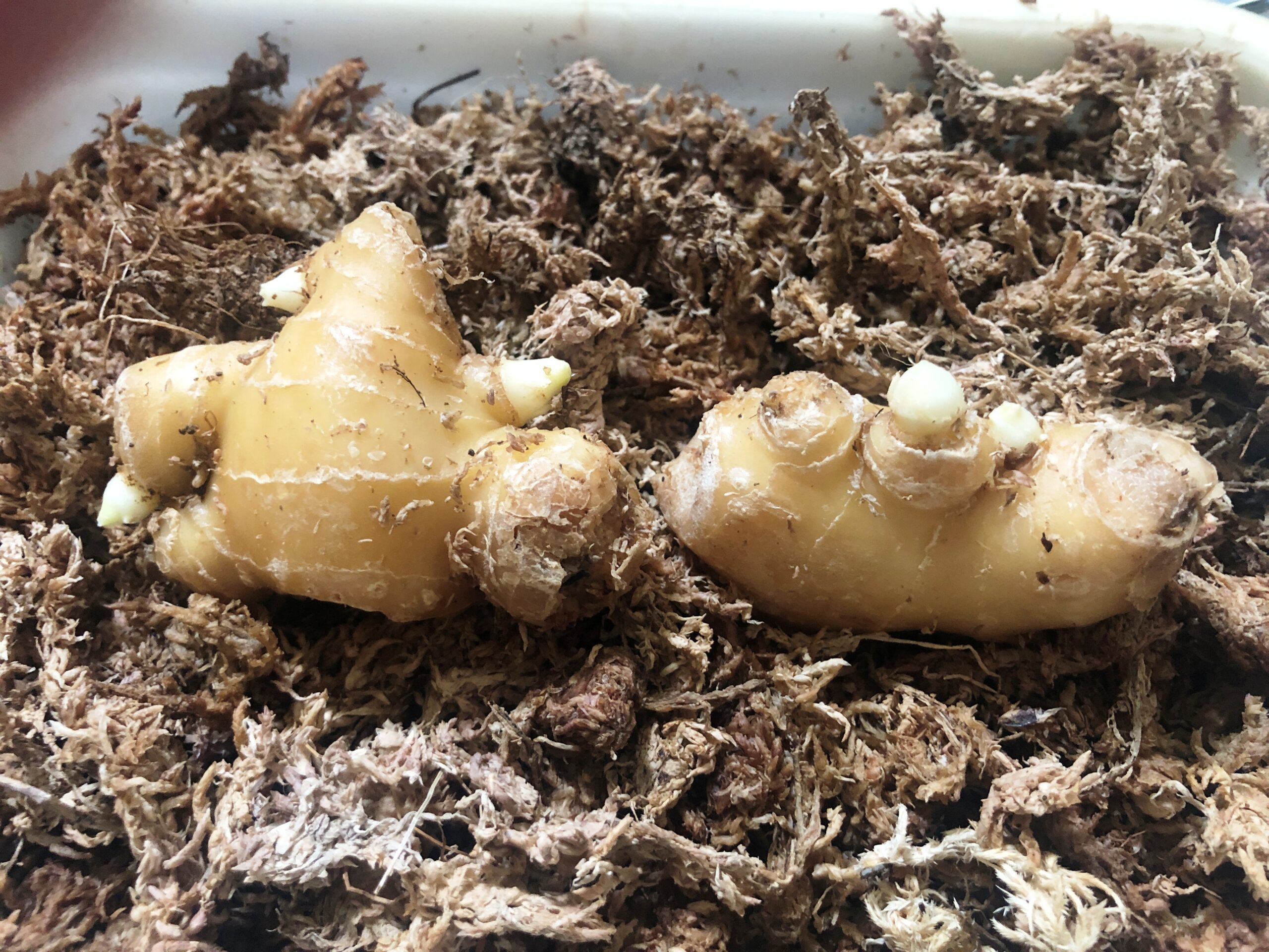 ミズゴケにショウガを埋めて芽出しを試していたら、無事に芽が出て来ました!